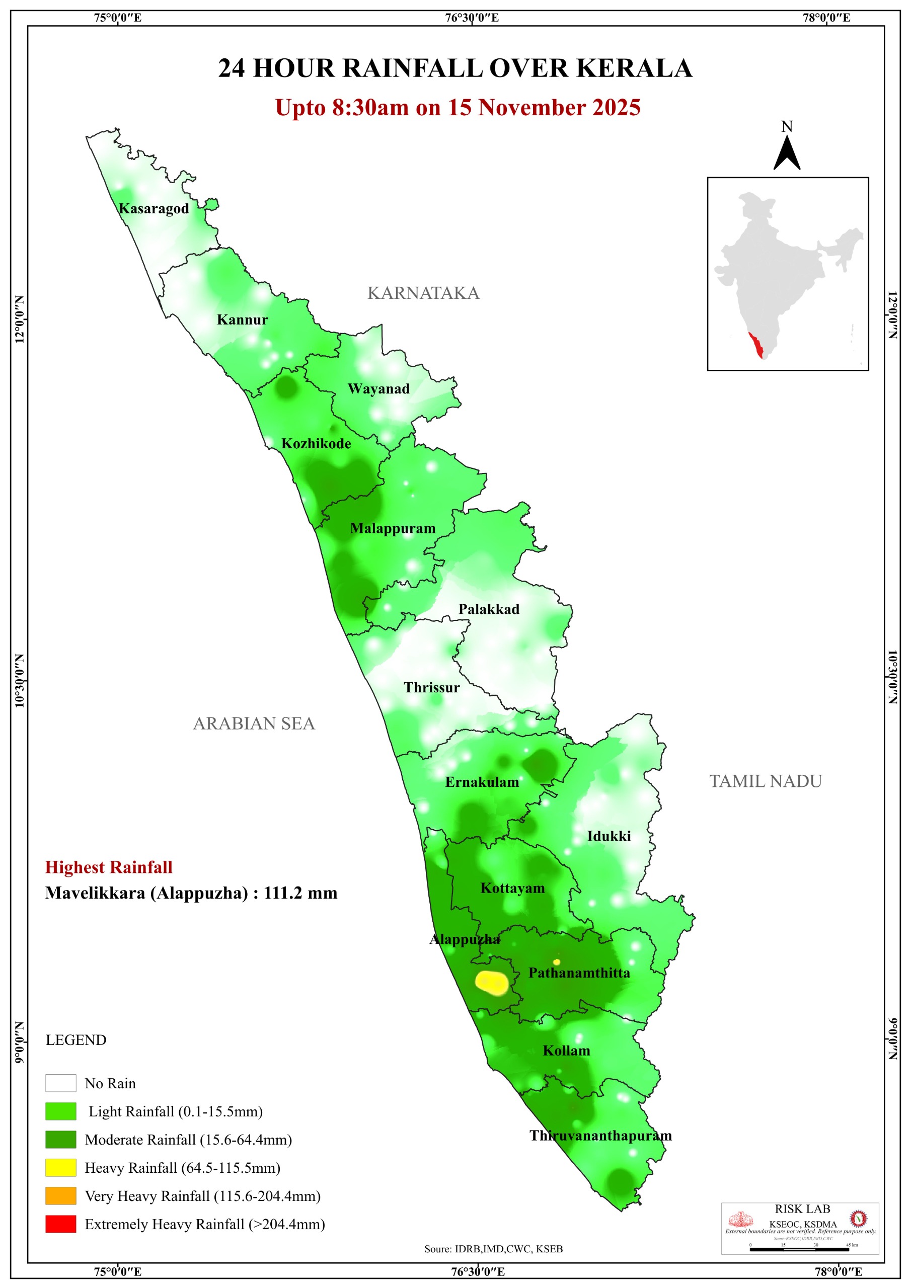 ഇന്ന് രാവിലെ 8.30 വരെ 24 മണിക്കൂറിൽ കേരളത്തിൽ ലഭിച്ച മഴ (15/11/2025)