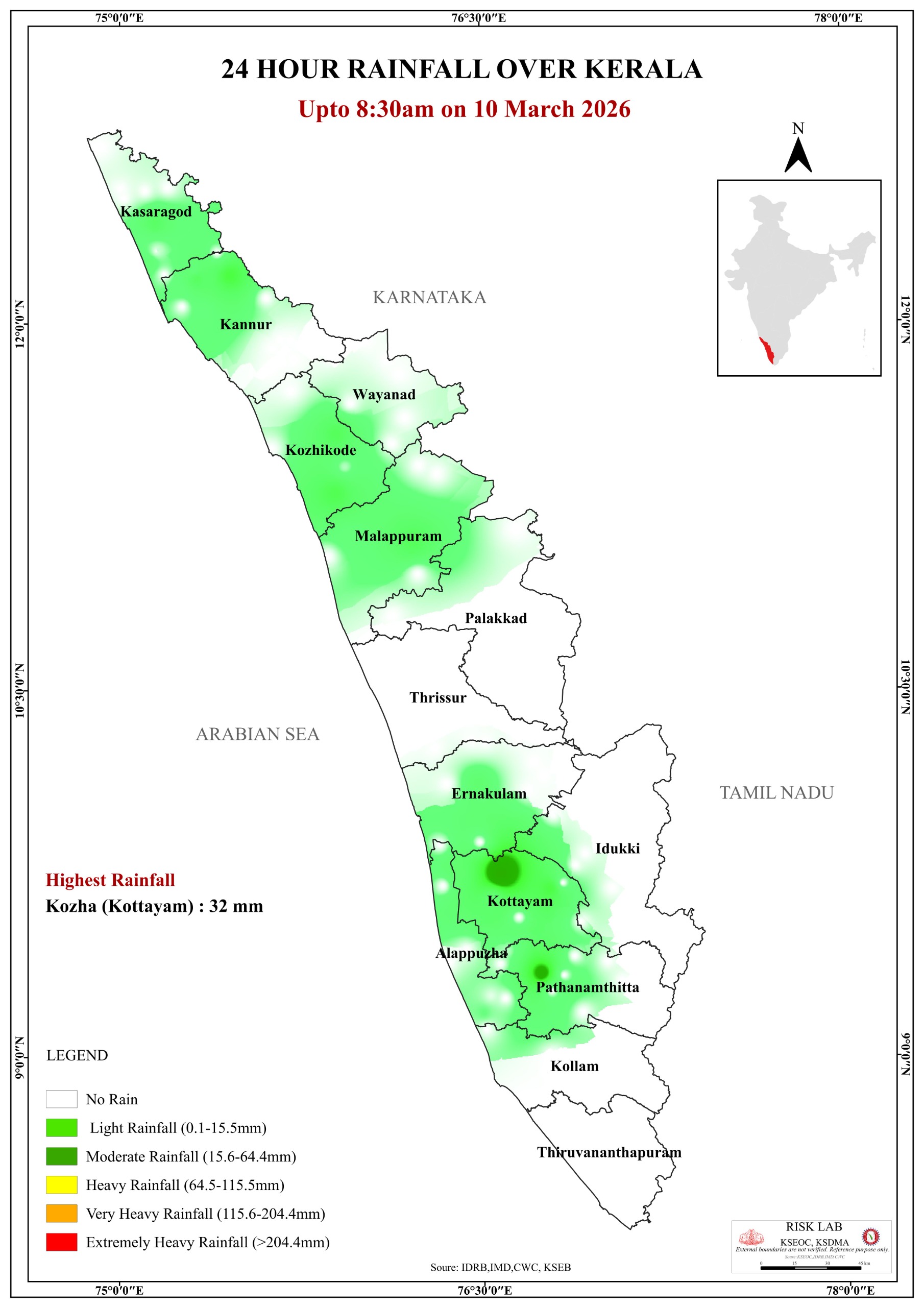 ഇന്ന് രാവിലെ 8.30 വരെ 24 മണിക്കൂറിൽ കേരളത്തിൽ ലഭിച്ച മഴ (10/03/2026)