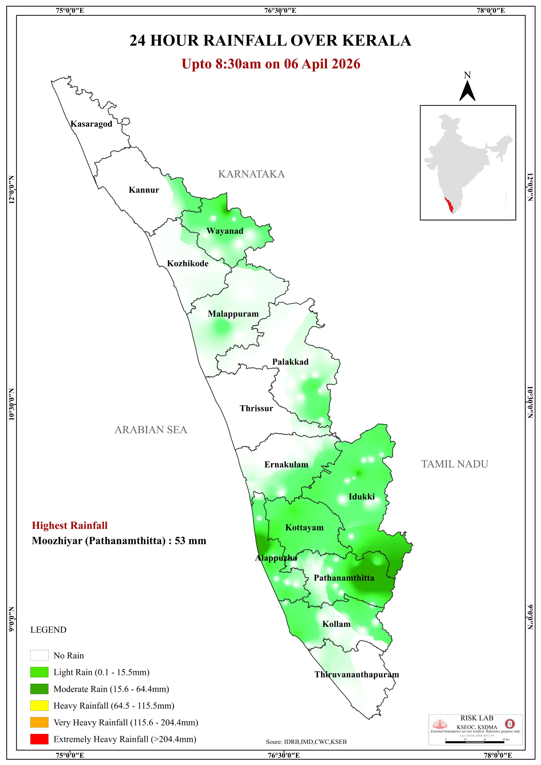 ഇന്ന് രാവിലെ 8.30 വരെ 24 മണിക്കൂറിൽ കേരളത്തിൽ ലഭിച്ച മഴ (06/04/2026)