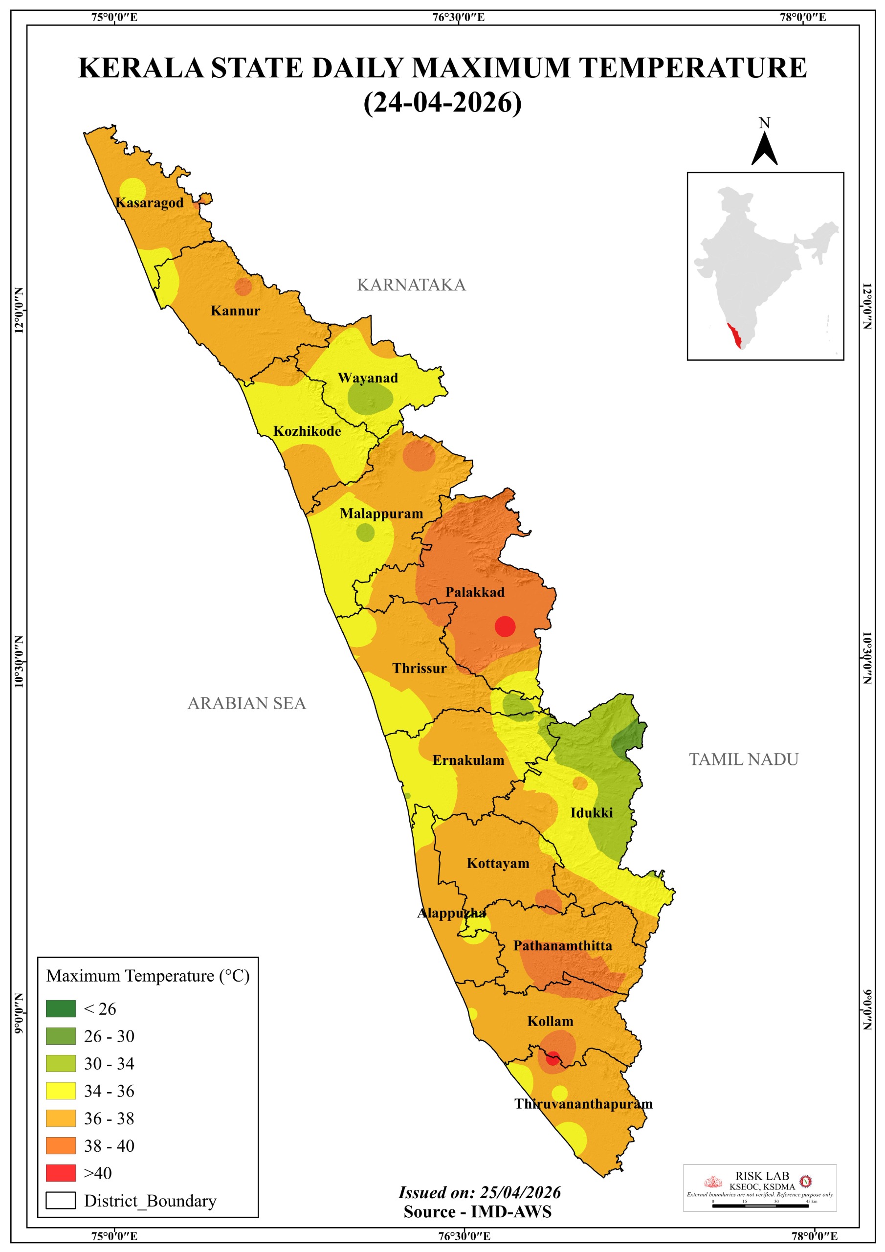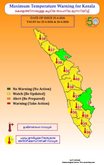 കേരളത്തിൽ ഇന്ന് (25/04/2026) & 26/04/2026 വരെ ഉയർന്ന താപനില പാലക്കാട് ജില്ലയിൽ 40 °C വരെയും; കൊല്ലം ജില്ലയിൽ 39 °C വരെയും; പത്തനംതിട്ട, തൃശ്ശൂർ, കോഴിക്കോട്, കാസറഗോഡ് ജില്ലകളിൽ 38 °C വരെയും; കോട്ടയം, എറണാകുളം, മലപ്പുറം,കണ്ണൂർ ജില്ലകളിൽ 37 °C വരെയും; തിരുവനന്തപുരം, ആലപ്പുഴ ജില്ലകളിൽ 36°C വരെയും ഉയരാൻ (സാധാരണയെക്കാൾ 3 to 4˚C വരെ കൂടുതൽ) സാധ്യതയെന്ന് കേന്ദ്ര കാലാവസ്ഥ വകുപ്പ് അറിയിക്കുന്നു.